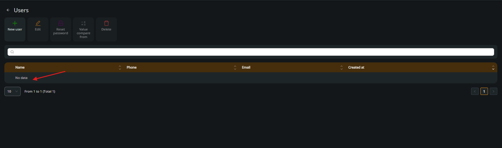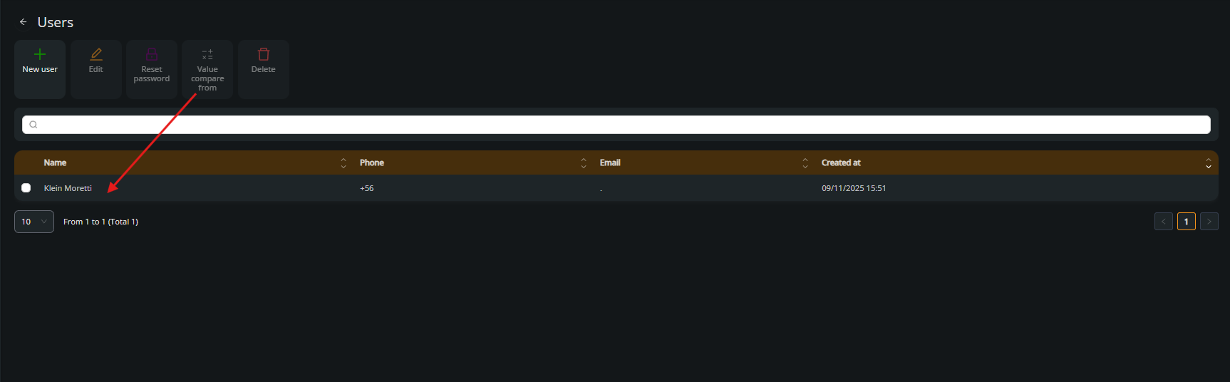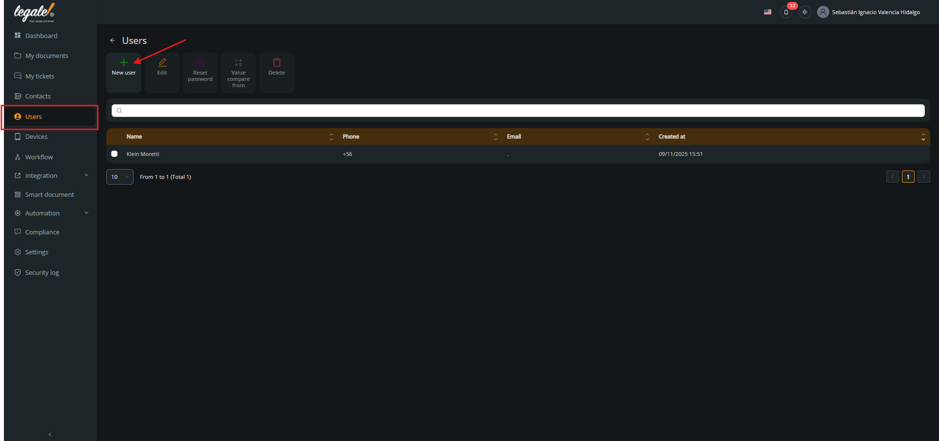 Click on the New user button to open the new user creation form.