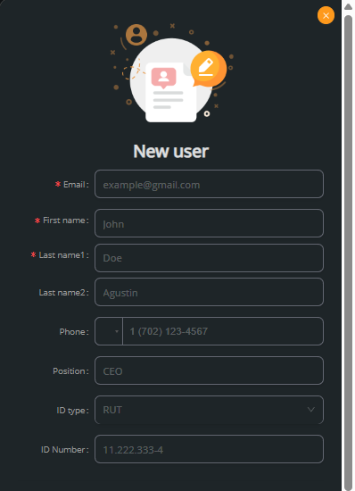Complete the required fields: email, first name, last names, phone number, position, ID type, and ID number.