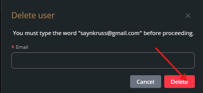 Type in the email address of the user to validate the deletion, then click Delete.