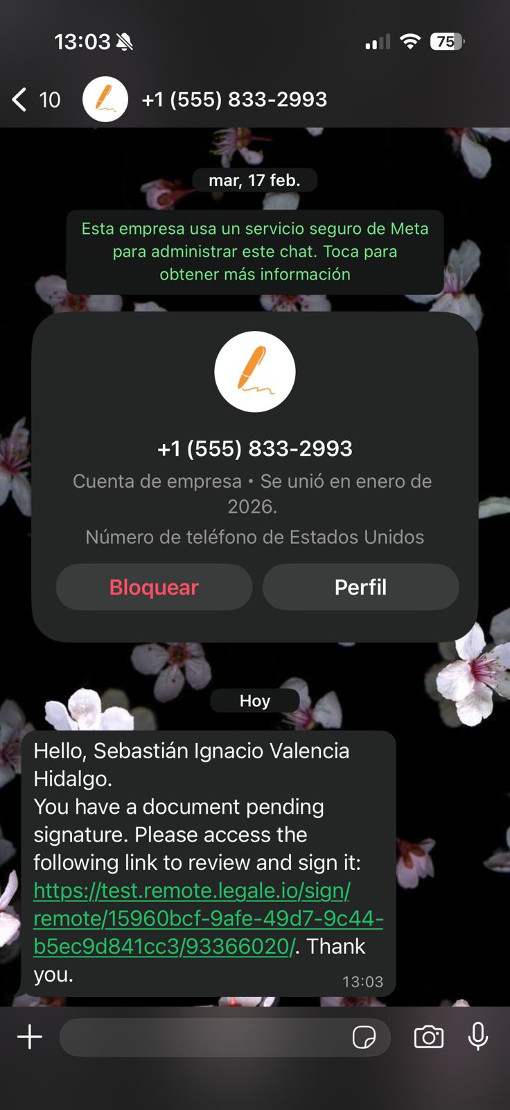 The signer will receive a WhatsApp message containing: