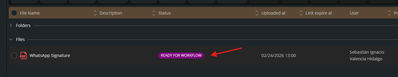 Once the document is uploaded, it will appear in the list with the status Ready for Workflow.