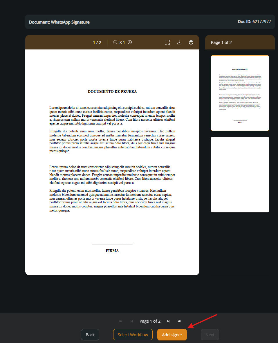 Open the uploaded document and click Add signer to start the signing configuration.