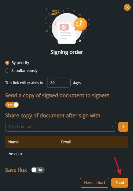 After configuring the signing order and options, click Send to deliver the document to the signer.